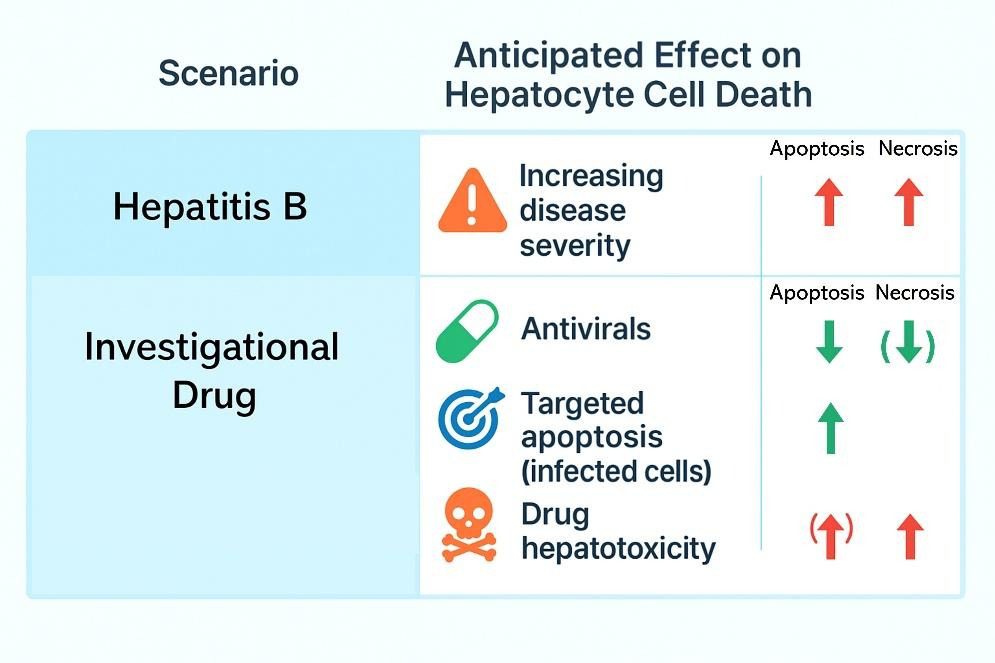 This can be studied by treating HBV-infected cell lines or liver organoids with investigational drugs, followed by measuring changes in apoptotic cell death using biomarkers such as ccK18. This is important for multiple reasons: