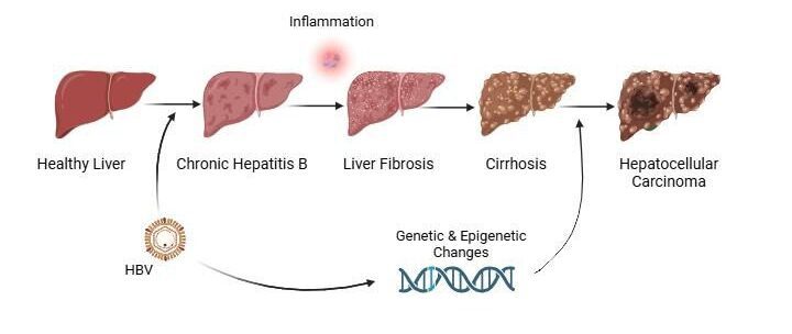Hepatitis B is a viral infection that is caused by the Hepatitis B virus (HBV). Infection with HBV primarily affects the liver, driving acute and chronic liver disease. Long-term HBV infection can lead to cirrhosis, liver failure, and hepatocellular carcinoma (HCC) (Figure 1). HBV infection is the leading cause of HCC and causes more than 850,000 deaths per year (Shen et al. 2023). Acute liver failure is a rare but severe complication of HBV infection, resulting in the sudden deterioration of liver function (Oketani et al. 2014). When Chronic Hepatitis B (CHB) advances to HCC, the liver undergoes a series of pathological changes through viral gene integration and epigenetic changes, chronic inflammation, persistent immune response, and tissue damage (Shen et al. 2023). Despite the availability of effective vaccines, HBV infection remains a global health concern, contributing to substantial morbidity and mortality worldwide (Shen et al. 2023).